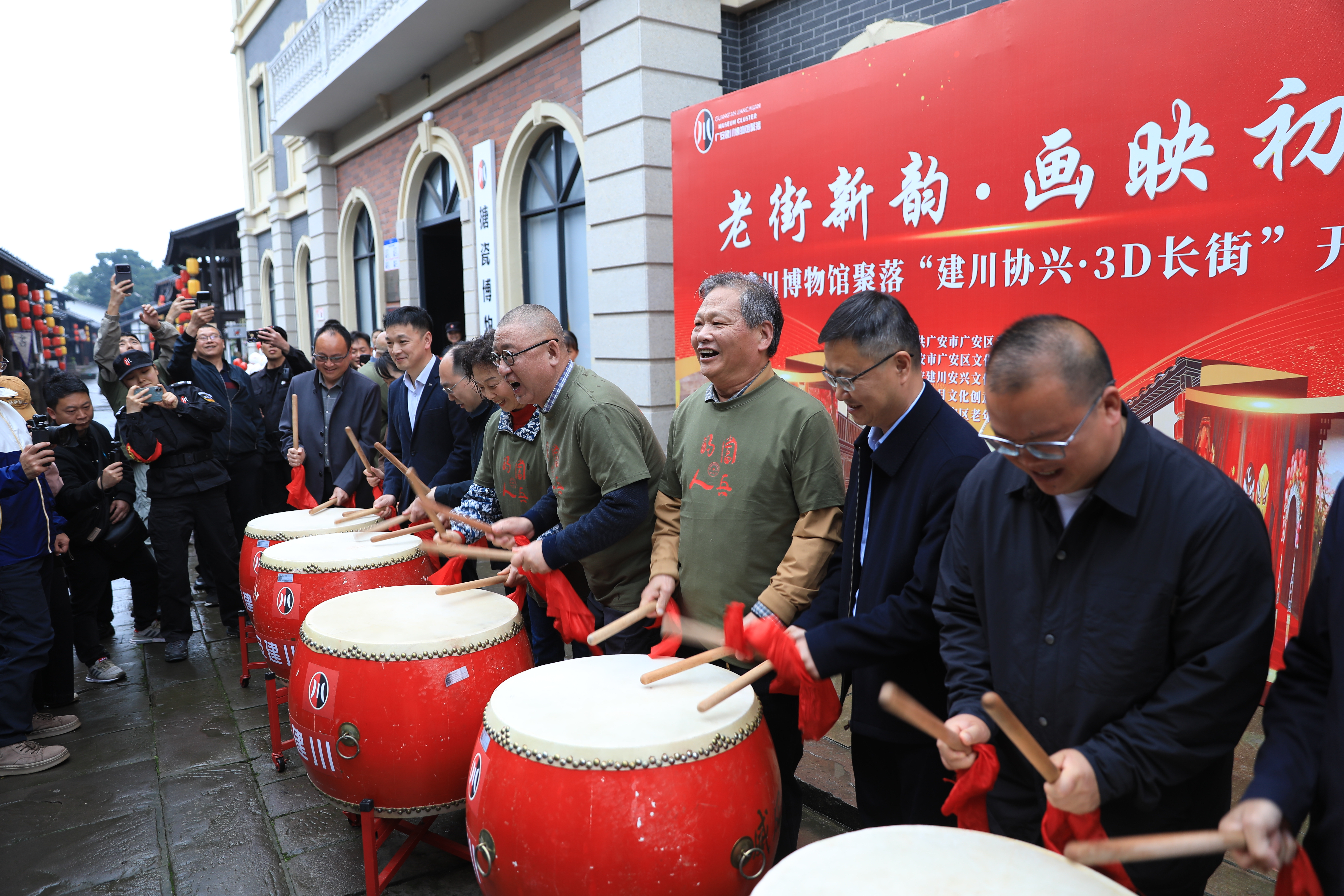 开街仪式现场热闹非凡,在激动人心的击鼓开街环节中,几位领导共同手握鼓槌,奋力敲击大鼓,“咚咚咚”的鼓声浑厚有力、响彻街巷,既是对百年老街的致敬,也是对3D长街崭新未来的呐喊。