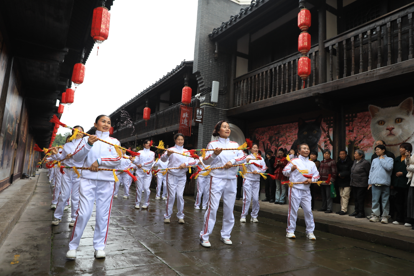 鼓点渐歇,精彩表演接踵而至,首先登场的是川剧非遗变脸表演,随着锣鼓声响起,演员振袖回眸、折扇轻挥,脸上的脸谱便在瞬息之间悄然变换,一张张色彩斑斓的脸谱交替出现,每一次变脸都伴随着雷鸣般的掌声与惊叹声,充分展现了川剧非遗的神奇魅力与独特风采。同时还有非遗连厢队惊艳亮相,队员们手持连厢棒,伴随着欢快的民俗曲调,迈着轻快的步伐翩翩起舞。